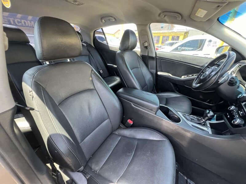 Presented in Titanium Silver, our 2015 Kia Optima SX is blending head-turning style and stellar performance. Powered by a 2.4 Liter 4 Cylinder offering 192hp perfectly matched to a 6 Speed Automatic transmission w/paddle shifters. This Front Wheel Drive team allows you to achieve up to 34mpg on the open road. Impressive acceleration and brilliant handling will have you looking for reasons to get out and drive your Optima! An aggressive and sleek exterior accented with 18-inch alloy wheels, front fog-lights, LED taillights and dual exhaust with chrome tips leaves people completely in awe. Take a look inside our SX and you'll notice the European-inspired and leather-trimmed cabin is both well-built and packed with amenities galore. Push-button starter, Bluetooth wireless technology, dual-zone automatic climate control, a cooling glove box, 8-way power-adjustable driver's seat, and an AM/FM/CD audio system with 6 speakers are just a few of the technologies you'll find. The Kia Optima is a recipient of the IIHS Top Safety Pick award thanks to features like 6 airbags, electronic stability control, and front and rear crumple zones among others. It's time to prove you still have a pulse by driving a sedan that stands out in the sea of mundane family sedans. Save this Page and Call for Availability. We Know You Will Enjoy Your Test Drive Towards Ownership!